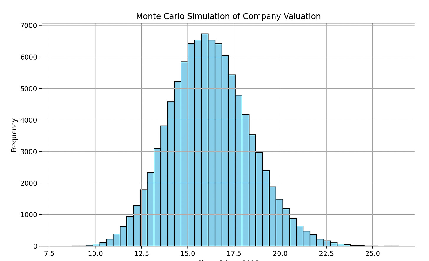 Let’s look at a case that’s slightly better. After 2 to 3 years, an annual revenue of 50 to 80 million $. Something that’s easy to achieve with all the growth prospects discussed earlier. With a profit margin of 15 to 20%. A constant share count of 11.1 million. Plugging this into a monte carlo simulator we get: